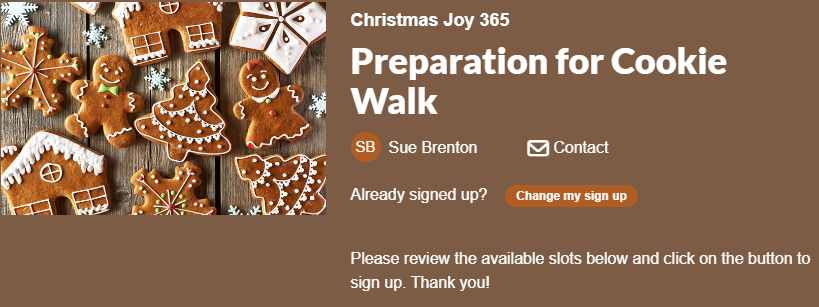To help make the Cookie Walk possible, please volunteer on Friday, Dec. 15 from 3-5 pm or Saturday, Dec. 16, from 8 am to 2 pm.
