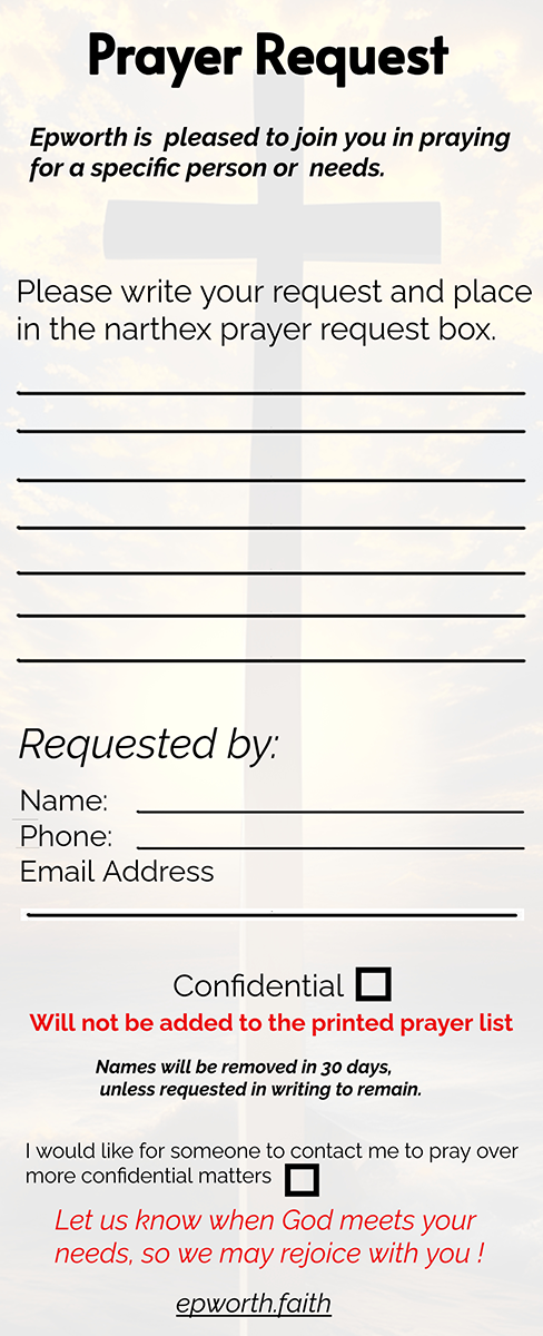 Epworth’s Caring Ministry is offering a new Prayer Request card in our pews and online (we’ll be offering a fillable PDF soon). For now, you may either print, fill out, and email a picture of your completed card to Mickie McManamon, or hand it to her in the lobby or office, or simply include the information on the card in an email to Mickie.